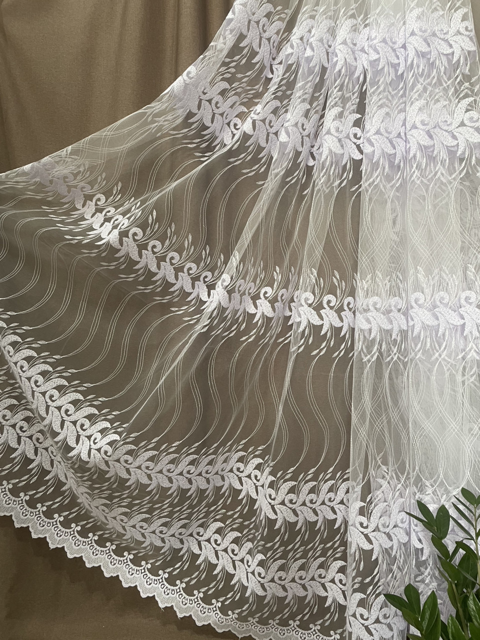 Тюль з об'ємною вишивкою, яка має легкий блиск.